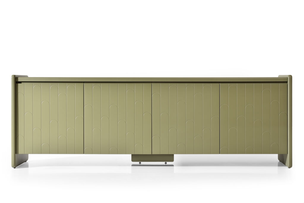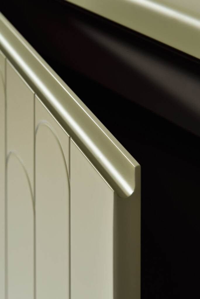 - Détails arrondis : les côtés du meuble sont arrondis jusqu’au sol, se fondant harmonieusement dans les pieds et créant un look fluide et élégant.